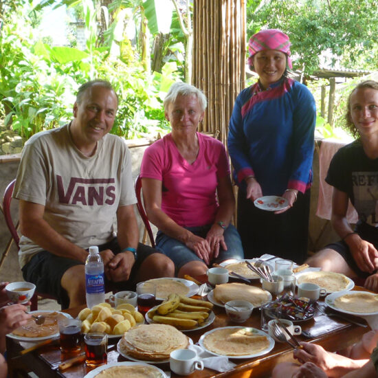 Set at the bottom of Hoang Lien Son mountain overlooking Muong Hoa river, Soi’s Homestay is an beautiful destination for travelers who love to stay in a quiet space close to the nature. Homestay is original and is over 70 years old. On this trip, you will trek along Muong Hoa river sneaking through the valley nearby Sapa town which is surrounded by huge rice paddy terraces. The night you spend in Ta Van village, the unique village in Sapa area where Giay minority live, will be an authentic experience with Mrs Soi’s family.